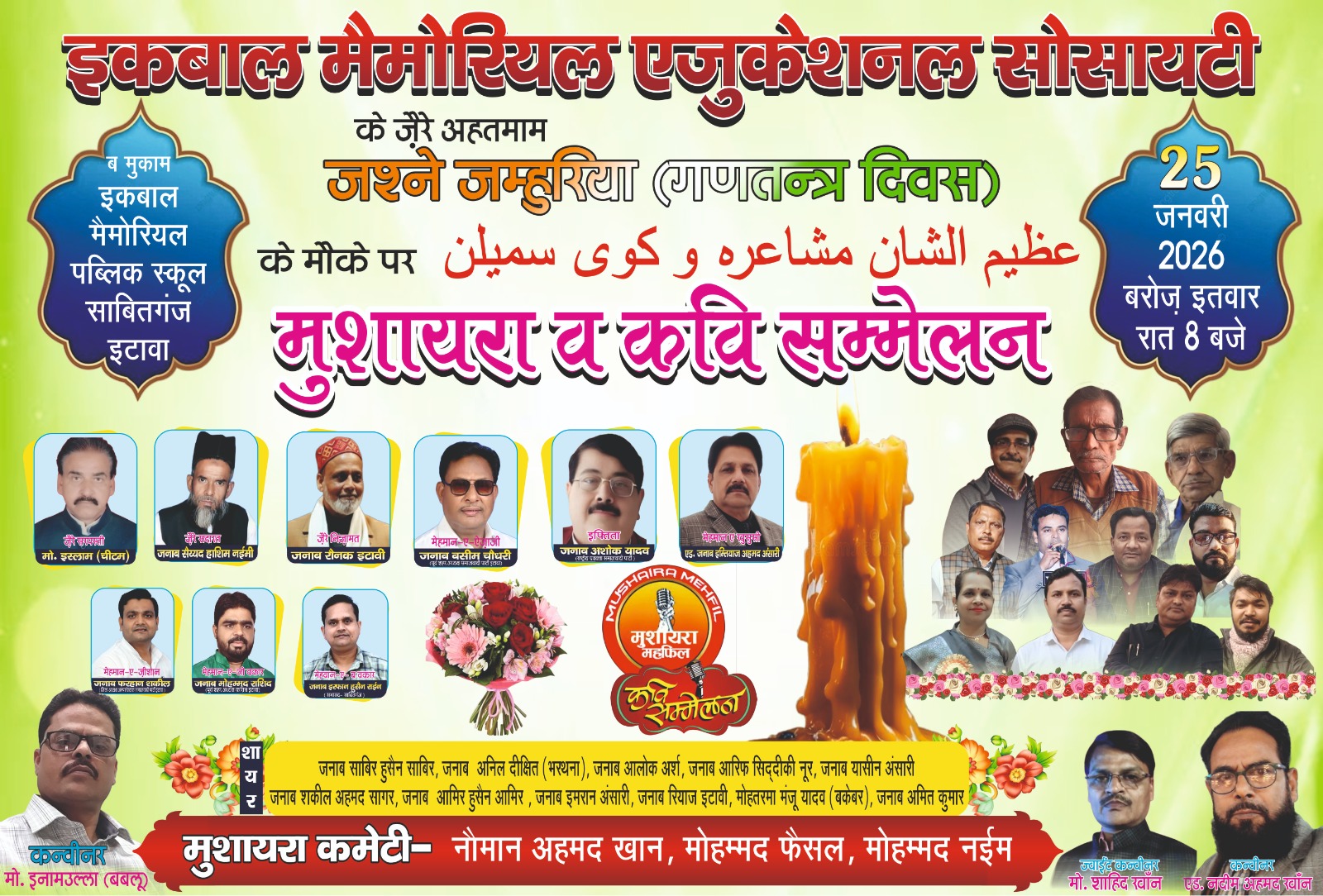 इटावा। इकबाल मेमोरियल एजूकेशनल सोसायटी के तत्वावधान में गणतंत्र दिवस के मौके पर 25 जनवरी दिन इतवार को रात 8 बजे साबित गंज स्थित इकबाल