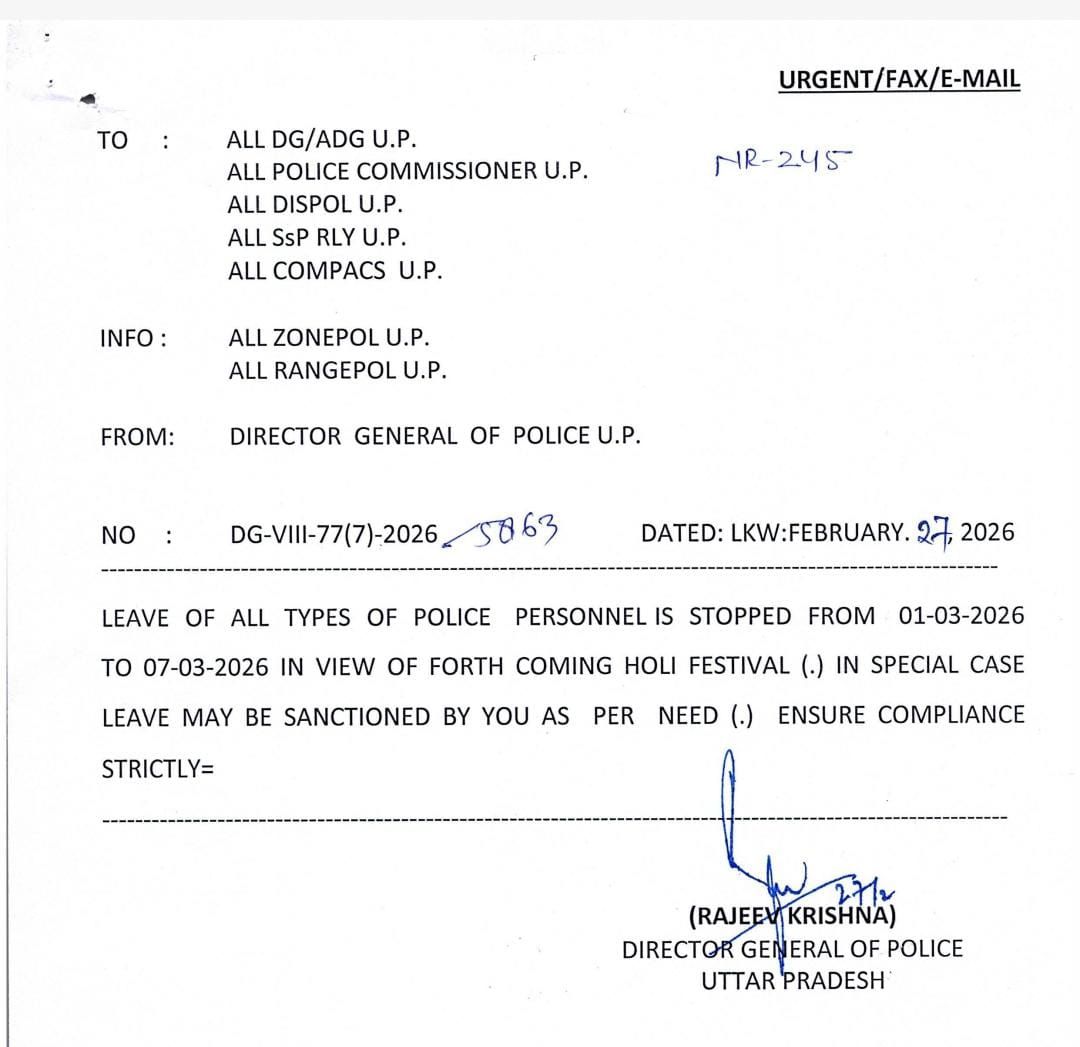 त्योहारों के दृष्टिगत पुलिस विभाग के अवकाश रद्द आदेश जारी